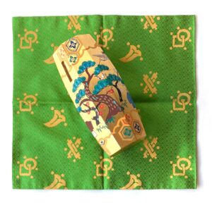 Cha-wan, 茶碗; tea-bowl; gray and pink glazed ceramic, O-suna yaki, お砂焼, Hon.-sand fired, by Kawa–hara Tō–sai, 川原陶斎, River-field Ceramic-abstain, Miya-jima–guchi, 宮島口, Palace-island-mouth. Made for Itsuku-shima Jin-ja, 厳島神社, Strick-island God-shrine. The color variation is made by grains of sand from the beach of the Shrine. Ko-buku-sa, 古帛紗, old-cloth-gauze, green silk fabric square with gold thread circle and square motifs, made for the acknowledgement of Za-bō-sai, 坐忘斎, Sit-forget-abstain, as Waka-Sō-shō, 若宗匠, Young Sect-worker, to become XVI Iemoto of Urasenke, at Hei-an Jin-gū, Kyōto. Generations of Urasenke Iemoto have presented Ken-cha, 献茶, Offering-tea, at this sacred place.