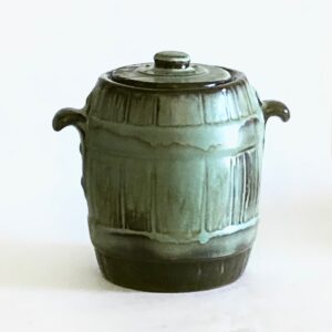 Covered vessel in the form of a barrel, with wing handles, terra cotta, with green glaze, Frankoma; h. 516cm. Cracker jar used as a mizu-sashi, 水指, water-vessel.