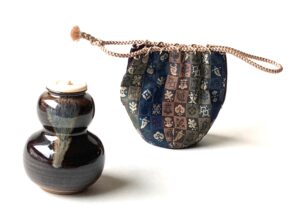 Cha-ire, 茶入, tea-receptacle; brown ceramic hisago, 瓠, bottle gourd, by Ban-dai Ki-zan, 万代㐂山, Ten thousand-generation Joyous-mountain, Kyōto, with ivory lid and silk, drawstring shi-fuku, 仕覆, work-cover, with a pattern of ‘Ichi-matsu Takara Don-su’, 市松宝緞子, City-pine Treasure Damask-of. The bottle gourd-shape jar is one of the oldest and most revered chaire in Japan.