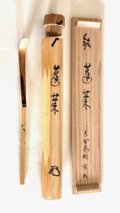 Cha-shaku, 茶杓, tea-scoop; bamboo naka-bushi, 中節, middle-node, crafted by Kage-bayashi Sō-toku, 影林宗篤, Shadow-grove Sect-kind; L. 6 sun kane-jaku. The chashaku is named ‘Hō-rai’, 蓬莱, Mugwort-goosefoot, the mythic realm in which the gods gather. The name was given by Matsu-naga Gō-zan, 松長剛山, Pine-long Strong-mountain, abbot of Kō-tō-in, 高桐院, High-paulownia-sub temple, Dai-toku-ji, 大徳寺, Great-virtue-temple, Kyōto. Hōrai is the name of the temple’s Tearoom which was a favorite of Ennōsai, 円能斎, Circle-art-abstain, XIV Iemoto of Urasenke. Coincidentally, the bamboo artist’s name, toko, 篤, is composed of the Kanji for bamboo, take, 竹, and horse, uma, 馬.