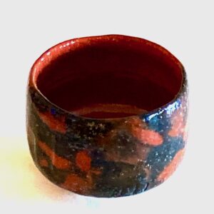 Cha-wan, 茶碗, tea-bowl, ceramic, aka-raku, 赤楽, red-pleasure, with black accents and suna-gusuri, 砂薬, sand-glaze, H. 2.2 sun kane-jaku, Mura-ta Tō-in, 村田陶隠, Town-field Ceramic-seclusion, Yama-shina, 山科, Mountain-department.