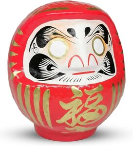 Daruma nin-gyō, だるま人形, Daruma person-form, made of papier-mâché, with a concealed weight that causes it to always end upright. The Kanji fuku-iri, 福入, fortune-enter, is written in gold on his body. His eyebrows represent tsuru, 鶴, cranes, which live a thousand years, and his moustache represent kame, 亀, turtles, which live ten thousand years. Hence the Daruma doll is present at happy times.