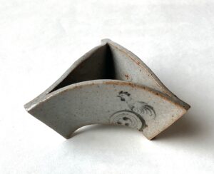 Three-sided futa-oki, 蓋置, lid-place, in the shape of sen-men, 扇面, fan-face, with a design of a niwatori, 鶏, chicken, on a drum. On another side is the design of a shi-me-nawa, 注連縄, flow-along-rope, with paper streamers, all are emblems of Shintō. Illegible stamp: w. 3 sun kane-jaku. The object is suitable as a futaoki, however, its original intended use is unknown.