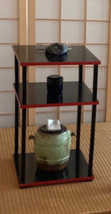 Kō-kō-dana, 更好棚, again-chose-shelf, ni-ju-dana, 二重棚, two-tier-shelf, with four posts, and lacquered black throughout with shelf edges trimmed in tsuma-gure, 爪紅, nail-red, choice of Gen-gen-sai, 玄々斎, Mystery-mystery-abstain, XI Iemoto, Urasenke. According to the old traditional calendar, Gengensai was born in year 1810, which corresponded with the zodiac sign for the year Kanoe-Uma, 庚午, Metal-Horse. The year 2026, a Horse Year, and the 216th anniversary of Gengensai’s birth.