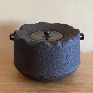 The block-form kan-tsuki, 鐶付, metal ring-attach, may allude to the white blocks in the wisteria ash bed of certain furo. The form of the ash bed was created as a way to honor the importance of Hai-gata Yama, 灰形山, ash-form mountain, located in Ari-ma, 有馬, Have-horse. This area was of particular interest to Hideyoshi and Sen no Rikyū. The irregular rim of the kama may evoke Ro-kkō-san, 六甲山, Six-shell-mountain, range of mountains in the Arima area.