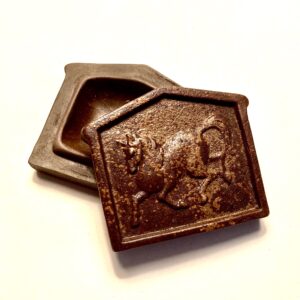 Kō-gō, 香合, incense-gather, in the form of an e-ma, 絵馬, picture-horse, with an image of an uma, 馬, horse, Bi-zen-yaki, 備前焼, Provide-before-fired, by Ki-mura Tō-hō, 木村陶峰, Tree-town Ceramic-peak; H. 1.6 sun kane-jaku.