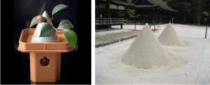 Right: two conical mounds of sand as offerings to the gods of Kami-gamo Jin-ja,上賀茂神社, Upper-joy-dense God-shrine, Kyōto. The sand cones are a constant presence of the sacred grounds, and which may allude to the mounds of salty sand collected and dried in sun, extracting the salt.