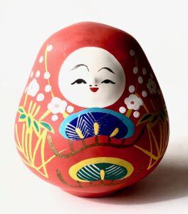 Nin-gyō, 人形, person-like, doll of Hachi-man Oki-agari, 八幡起き上がり, Eight-penant Get-up, roly-poly dolls. Originating in the Heian period at the Yasu-e Hachi-man-gū, 安江八幡宮, Peace-bay Eight-penant-palace, in Ka-ga, 加賀, Increase-joy. The doll represents Ō-jin Ten-nō, 応神天皇, Answer-god Heaven-emperor, military leader, who dressed as a baby wrapped in red swaddling cloth like an aka-chan, 赤ちゃん, red-‘little one’. Indicating that he was an infant Hachi-man, 八幡, Eight-banners, the greatly revered god of war. Adorning his robe are the very auspicious designs of shō chiku bai, 松竹梅, pine bamboo ‘plum’ that are displayed at the New Year, and other festivities.