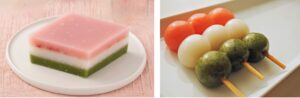 Left: hishi mochi, 菱餅, diamond mochi. Right: san-shoku dan-go, 三色団子, three-color round-of.