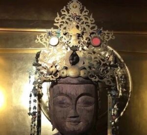 Kannon with crown adornment which includes two disks – one red, , 紅, in the east representing the sun, nichi, hi, 日, and one white, haku, 白, representing the moon, getsu, tsuki, 月, in the west. Kō-haku is a concept seen in many aspects of Japanese culture. The figure of Shō Kan-ze-on, 聖観世音菩薩, Holy See-world-sound Grass-buddha, from the Heian period, which has been adorned with gold filigree ornament after the 17th century, treasured at Fu-mon-ji, 普門寺, Universal-gate-temple, Toyohashi, Aichi Pref.