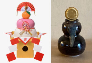 Left: kagami mochi with pink/red mochi placed on top of larger white mochi – a red, twisted cord tied around the middle, a daidai, orange placed on the top.