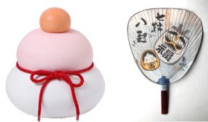Right: uchiwa, 団扇, round open fan with an image of two roly-poly dolls of Daruma, enrobed in white, and a small figure of Otafuku enrobed in red/orange. The profile of the uchiwa is the shape of Daruma inverted – hi-kkuri kaesu, 引っ繰り返す, ‘to turn something over’.