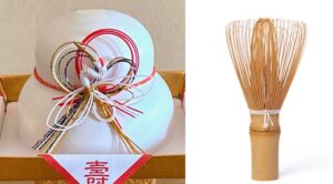 Left: two rounds of mochi with red and white mizuhiki, the paper strings that ‘tie’ the two mochi together. A decorative goshiki of five colors including the image of a crane, that is believed to live a thousand years. The pictured crane is named, tan-chō tsuru, 丹頂鶴, red-crown crane, (Grus japonensis), as it has a patch of red feathers on the top of its head, Right: a bamboo cha-sen, 茶筅, tea-whisk, with a white string that keeps the outer tines separated.