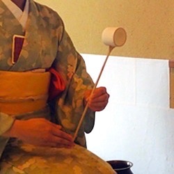 Teishu holding the ladle like a mirror – kagami bishaku. Photo courtesy of Urasenke, Kyōto.