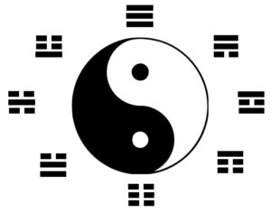 Taji symbol, known in Japanese as Taikyokuzu, with the foundational eight trigrams that form the Cosmos. The trigram for Heaven, Ken, 乾, , is pictured at the top of the diagram, North, and the trigram for Earth, Kon, 坤, , is pictured at the bottom, South.