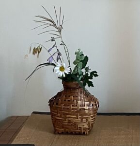 A hana-ire, 花入, flower-enter, displayed on tatami usually is placed on an usu-ita, 薄板, thin-board, however, baskets have a liner to hold water, so that the basket itself fulfils the function of an usuita. Flowers that bloom out of season may be displayed in the 10th month.