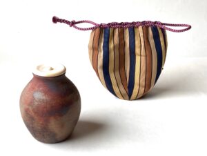 Cha-ire, 茶入, tea-receptacle, unglazed brown stoneware jar with fire markings; H. 2.8 sun kane-jaku, by Makoto Ya-be, 誠矢部, Truth Arrow-guild, Boxford, Mass., with ivory lid, and silk bag, shi-fuku, 仕覆, serve-cover, Ao-ki kan-tō, 青木間道, Green-tree Interval-way.