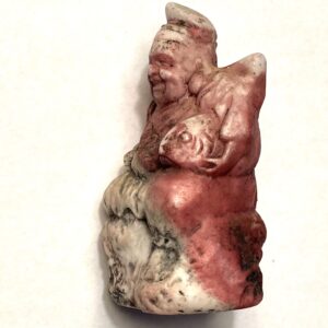 Ebisu is the god of fishermen, merchants, wealth, and one of the Shichi-fuku-jin, 七福神, Seven-fortune-gods. He holds a tsuri-sao, 釣竿, fish-rod, and a large fish called a tai, 鯛, sea bream, red snapper. There is wordplay on ‘tai’, in the expression, o-me-de-tai, お目出度い, hon.-eye-out-occur. The source is the open-eyedness of Daruma’s enlightenment.