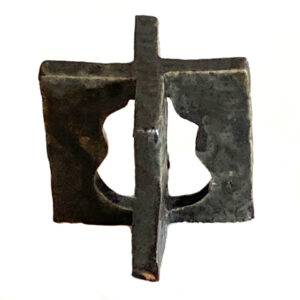 ‘Hachiyo’ futa-oki, 八瓢 蓋置, Eight-gourds lid-place; ceramic X with an openwork image of a hisago, 瓢, gourd, with irregular black glaze, h. 1.8 sun kane-jaku, designed by Palmer and made by Steve Murphy, Boston Ceramics, Boston, Mass. Made as a remembrance of my reaching the age of 88, in Japanese, hachi-jū-hachi, 8 + 8. The character for 8 as in the West, is symbolic of infinity. Eight eights are symbolic of Infinity in Space. The shape of the gourd resembles the Arabic number 8. If written vertically in Kanji, 八十八, these three characters stacked together create the character for rice, 米. With this style of writing, the numbers make the character for rice, also called bei, kome, 米. The most auspicious age of 88 in Japanese is Bei-ju, 米寿, Rice-longevity. Eight times eight equals 64, which may evoke the 64 hexagrams of the I Ching, Eki-kyō, 易経, Change-sutra.
