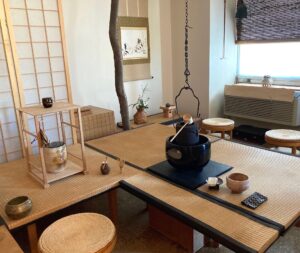 In Chanoyu, it is the custom to move the fu-ro, 風炉, with-hearth, to the middle of the utensil tatami, toward the end of the 10th month. This placement is called naka-oki, 中置, middle-place. It is thought that as the weather becomes colder with the approach of winter, the furo provides more heat for the comfort of the guests. This may have some truth, however, the furo can be used year round, and where there is no ro in the floor of the Tearoom, the furo is returned to the left side of the utensil tatami.