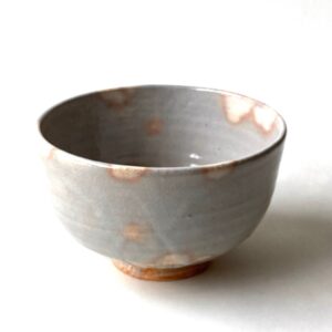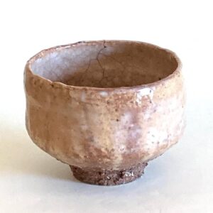 Cha-wan, 茶碗; tea-bowl; gray and pink glazed ceramic, O-suna yaki, お砂焼, Hon.-sand fired, by Kawa–hara Tō–sai, 川原陶斎, River-field Ceramic-abstain, Miya-jima–guchi, 宮島口, Palace-island-mouth. Made for Itsuku-shima Jin-ja, 厳島神社, Strick-island God-shrine; sand from the beach around the shrine is incorporated with the clay, which gives the variations in the glaze of the bowl. People used to collect a handful of sand from the shrine, as a sacred souvenir.