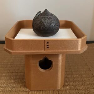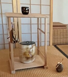 The plain wood display stand is a variation of the Ha-kkei Dana, 八景棚, Eight-views Shelf, created by I-guchi Kai-sen, 井口海仙, Well-opening Sea-hermit. The Hakkei dana can be assembled to approximate eight different styles of display stand. Iguchi Kaisen was the younger brother of Tan-tan-sai, 淡々斎, Fleeting-abstain, XIV Iemoto, Urasenke.