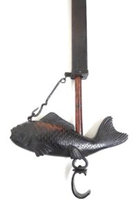 An ancient tradition in Japan is hanging a kettle for hot water over a fire in the i-ro-ri, 囲炉裏, enclose-hearth-inner, which is called a ji-zai kage, 自在鉤, self-exist hook. In Chanoyu, the hanging kettle is called a tsuri-gama, 釣釜, fish-kettle. The brace to hold the kettle in place is called a yoko-gi, 横木, side-wood, and is often in the shape of a fish or a sen-su, 扇子, fan-of. Rikyū had a bamboo pole to hang the kama, with the yokogi is called a ko-zaru, 小猿, little-monkey. The fish is modeled after Ebisu’s tai, 鯛, sea bream, which is appropriate as Ebisu is the god of fisherman.