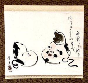 Painting of masks of E-bi-su-ten, 恵比寿天, Bless-like-longevity-heaven (Deva) and an attendant, Fuku musume, 福娘, Fortune daughter, with calligraphy (illegible). Signed, Ha-zuki, 葉月, Leaf-month (lunar calendar). The painting may have been created for the early January celebration and market of Tō-ka E-bi-su, 十日恵比須, 10-day Bless-like-longevity-heaven (Deva), held at shrines all over Japan. Shrine maiden’s dispense souvenirs of the event.