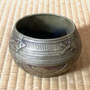 Rice measure, polished brass lost-wax cast molded with a ‘basket’ design of ropes and fish; h. 8.7 cm, (diam. 13.5 cm.) India. Used as a ken-sui, 建水, build-water, for waste water.