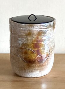 Mizu-sashi, 水指, water, ceramic with mottled glaze in the manner of American ‘raku’, by Ō-hi Toshi-o, 大樋年雄, Great-trough Year-male; H. 6 sun kane-jaku, made while he was a student at Boston University, in 1984. With a black lacquered wood lid.