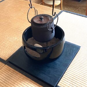 Ga-ran-dō, 伽蘭洞, Attend-orchid-cave, utensils and arrangement for a Tea presentation called Naka-oki, 中置, Middle-place. The portable fu-ro, 風炉, wind-hearth, has been placed on the area above the sunken ro, 炉, hearth (ro-dan, , hearth-foundation). The kama, 釜, kettle, has been suspended by a kusari, 鎖, chain, dispensing with the trivet-like go-toku, 五徳, five-virtues, simulating the absence of the supporting collar, koshiki, 甑, [wok] ring support, of the yatsure bu-ro, 窶れ風炉, timeworn wind-hearth.