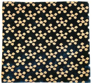 Ko-buku-sa, 古帛紗, old-cloth-gauze, blue-black silk with pattern in gold of Rikyū-bai kin-ran, 利休梅金襴, Rikyū-Japanese apricot gold-brocade. Keepsake from Urasenke after a week of intensive study and practice called kō-shū-kai, 講習会, lecture-learn-meeting. In a shrine rite, Ebisu is represented by a branch of ume, 梅, ‘prunus’, and Dai-koku-ten, 大黒天, Great-black-heaven (Deva), is represented by a bag of rice.