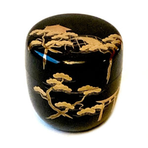 Natsume, 棗, jujube; black-lacquered, ovoid, covered container with ‘Sumi-yoshi maki-e,’ 住吉蒔絵, Live-well embed-picture, in gold and inlaid shell, by Take–uchi Kō-sai, 竹内幸斎, Bamboo-inside Blessing-abstain; H. 1.8 sun kujira-jaku.
