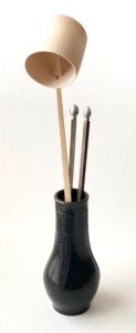 Kazari bi-shaku, 飾柄杓, handle-ladle, bamboo, kazari hi-bashi, 飾火箸, display fire-rods, copper and silver alloy, displayed in a shaku-tate, 杓立, ladle-stand, Kara-kane, 唐銅, Tang-copper, with silver gingko nut, gin-nan, 銀杏, silver-apricot, finials, Hō-un-sai, 鵬雲斎, ‘Phoenix’-cloud-abstain, XV, Iemoto, Urasenke.