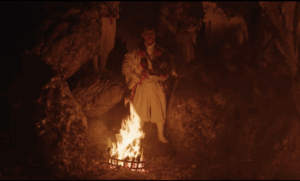 Meanwhile, at Tōdaji, the fire display from the balcony of Nigatsudō is provided for the public on the first nine nights of the ceremony. For the first nine nights there are 10 monks who carry the long flaming torches; they are joined on the final 10th night by an 11th monk. The largest display is in the early evening on the last night of the observance when fire rains down from great torches, tai-matsu, 松明, pine-bright, onto the worshippers below the veranda.