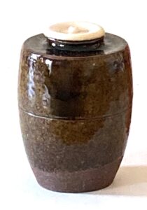 Cha-ire, 茶入, tea-receptacle, cylindrical stoneware jar with kata-tsuki, 肩衝, shoulder-thrust, with brown mottled glaze, form called ‘Yari no Saya’, 槍の鞘, Spear ’s Sheath, Tan-ba, 丹波, Red-wave, by Ichi-no Katsu-ki, 市野勝磯, City-field
