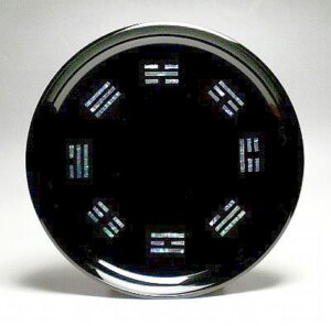 Ha-kke bon, 八卦盆, eight-sign tray, black-lacquered wood with shell inlay of the eight trigrams of the Eki-kyō, 易経, Change-sutra. 8.8 sun kujira-jaku. The hakke bon trigrams, 三卦, three-sign, shown in the picture above from 12:00 clockwise are: Kan, 坎, Water, Gon, 艮, Mountain, Shin, 震, Thunder, Son, 巽, Wind, Ri, 離, Fire, Kon, 坤, Earth, Da, 兌, Lake, Ken, 乾, Heaven.