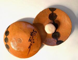 Two mei-mei zara, 銘々皿, name-name plate, terracotta dish made by Ei-raku, 永楽, Ever-pleasure, for the Miyako Odori, 京おどり, Capital-dance, in Kyōto. Diam. 4 sun kane-jaku. A different plate is made each year to serve sweets at a Tea held in the theater. The design in black glaze is of dango, an emblem of the group of geisha dance and the arts. The back has the dango design and calligraphy, ‘Miyako odori’. The mochi sweet on the dish is made of white an, 餡, modeled after the dango.
