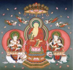When practicing forms of Buddhism related to teh Three Gates of Liberation, people may turn to any number of deities for support. One of the groupings of deities to which many Buddhist practitioners look is called the Shaka San-zon, 釈迦三尊, Explain-(sound) Three-lords. The Shaka Sanzon depicts the Buddha as the central figure Shaka-Nyorai, 釈迦如来, Explain-like-become, the historical Buddha, with his attendants, Fu-gen Bo-satsu, 普賢菩薩, Universal-wisdom Grass-buddha and Mon-ju Bo-satsu, 文殊菩薩, Literary-exceptional Grass-buddha.