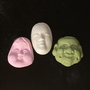 Three hi-ga-shi, 干菓子, dry-sweet-of, molded sugar and rice flour, in the images of Nō masks called Hana Omote, 花面, Flower-mask, by Chō-kyū-dō, 長久堂, Long- -hall. From the left = pink – Otafuku, white – young woman, and E-bi-su, 恵比寿, Joy-as-longevity.