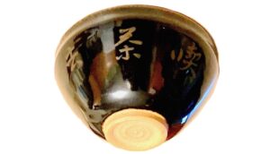 Cha-wan, 茶碗, tea-bowl, conical ceramic bowl in the style of ten-moku, 天目, heaven-eye, with black glaze and calligraphy in gold written from left to right, ki sa ko, 喫茶去, drink tea depart(!), with illegible signature. The bowl may have been from a number of tea bowls at a temple.