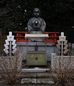 The seasonal festival associated with Otafuku is Setsu-bun, 節分, Season-divide. This is a seasonal celebration that is observed in both Buddhist and Shintō traditions. Setsubun occurs on the first day before spring according to the 72 seasonal divisions of the year. As part of the celebration, at both Buddhist temples and Shintō shrines, as well as in individual households, images of Otafuku can be seen and people participate in the purificatory and celebratory throwing of beans out of entranceways called mame-maki, 豆撒き, bean-scattering while exclaiming ‘oni wa soto, fuku wa uchi’, 鬼は外 福は内, demon out fortune in. Celebrating Setsubun is a way to both clear out the old and welcome in the fortunes of Spring. Sō-tan, 宗旦, Sect-dawn, Grandson of Rikyū, scattered beans from the nijiri-guchi, 躙口, edge forward-opening, to his Yū-in, 又隠, Again-retire, tea hut, for placing the stepping-stones of the ro-ji, 露地, dew-ground.