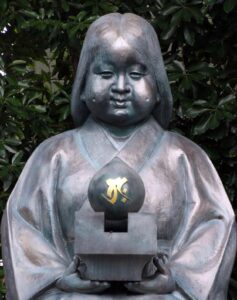 Okame was the wife of the master carpenter of the temple, who was faced with an issue in the construction around 1227. He had cut the central pillar too short to maintain the structure’s integrity, and asked his wife for help, to which Okame gave her advice. At that time it was considered a great disgrace for a man to receive and follow the advice of a woman. Okame sacrificed herself twice for her husband’s honor, first in offering the idea to reorient the original structural plan of the temple to her husband, and again when she is alleged to have taken her own life prior to the opening of the temple, so that her husband would not face humiliation. Both of her deeds have been framed as acts of compassion.